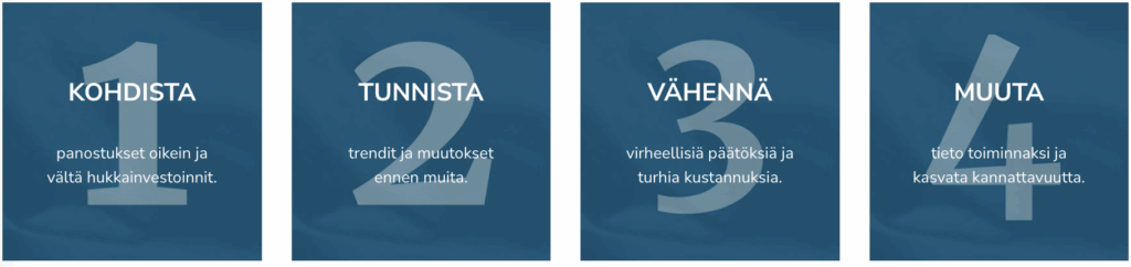 - Tehokkaampi resurssien käyttö auttaa kohdistamaan panostukset oikein ja välttämään hukkainvestoinnit.